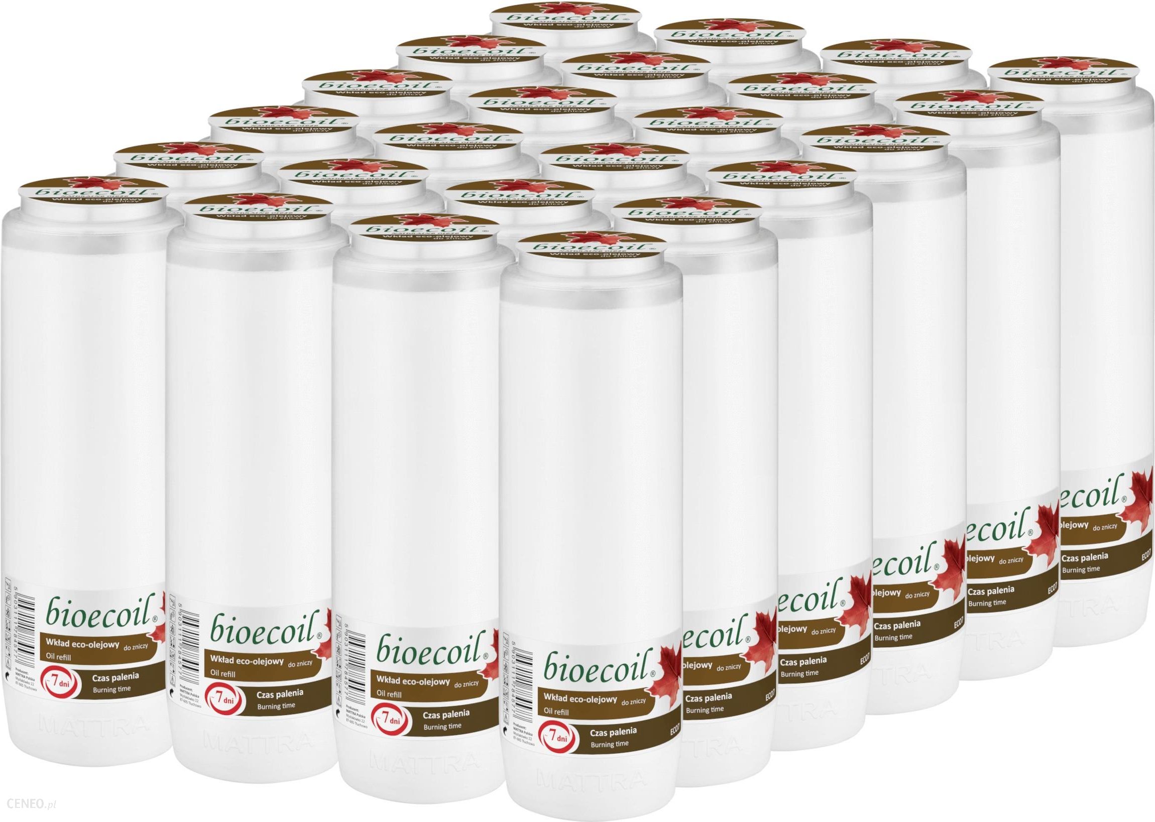 Wkład olejowy bioecoil® ECO7opakowanie 24 sztukiWkłady olejowe bioecoil® wykonane są z najwyższej jakości surowców, m.in. z 100% naturalnych olejów roślinnych pochodzących z recyklingu, a ich produkcja odbywa się pod czujnym okiem wykwalifikowanej kadry inżynierskiej.Stan: fabrycznie nowy, oryginalnyCechy produktu:czas palenia: 7 dni*typ wkładu: olejowy**wkłady wypalają się równomiernie do końca, nie niszcząc szkła zniczowegobrak kopcenia w każdym rodzaju szkłaetykiety odlepnewysokość 20 cmśrednica 6,5 cmspecyfikacja jakościowa: produkt certyfikowany PN-C-98000:2005GWARANTOWANY CZAS PALENIA* Czas palenia zależy od warunków pogodowych (np. temperatura, siła wiatru) i wynosi od 6 do 7 dni. Wkład do zniczy przeznaczony do użytku zewnętrznego w lampionach, prosimy przestrzegać załączonych symboli.**Wkłady olejowe do zniczy posiadają dwie mieszanki rekomendowane przez producenta:jesienno-ziomowo-wiosenną do wypalania w temp. -20C do +20C sprzedawane w dniach od 1 września do 28 lutego.wiosenno-letnio-jesienną do wypalania w temp. -10C do +30C sprzedawana w dniach od 1 marca do 31 sierpnia.Temperatury podane w opisie aukcji, dotyczą temperatur odczuwalnych w miejscu wypalania się wkładu. Zdjęcia zamieszczone na aukcjach mają charakter pokazowy, w rzeczywiści produkty mogą różnić się od stanu faktycznego odcieniem czy wysokością zalewy, w zależności od aktualnie dostarczanych surowców.Wkłady do zniczy bioecoil® posiadają oryginalne tuby, w znacznej części produkowane z tworzywa pochodzącego z recyklingu. Istotną cechą produktu jest estetyka wykonania, charakteryzują się one bowiem, przyjemną dla oka linią i solidnością wykonania.Tuby charakteryzują się podwyższoną odpornością na działania wysokich temperatur, podczas wypalania się wkładów do zniczy.Znakiem rozpoznawczym wkładów do zniczy bioecol® jest długi czas palenia, równy i jasny płomień, oraz czystość wypalania. Dzieję się tak, ponieważ wkłady wykonane są z najwyższej jakości parafin o powtarzalnym składzie, oraz wysokich temperaturach krzepnięcia.Wkłady do zniczy bioecoil® charakteryzują się wysoką powtarzalnością jakości w różnych warunkach atmosferycznych, przez co sprawdzają się nie tylko w takie dni jak: Wszystkich Świętych, Boże Narodzenie czy Wielkanoc, ale również we wszystkich innych okolicznościach oraz porach roku.Prawdziwy płomień wkładów do zniczy, to prawdziwy Czas Pamięci o naszych bliskich.
