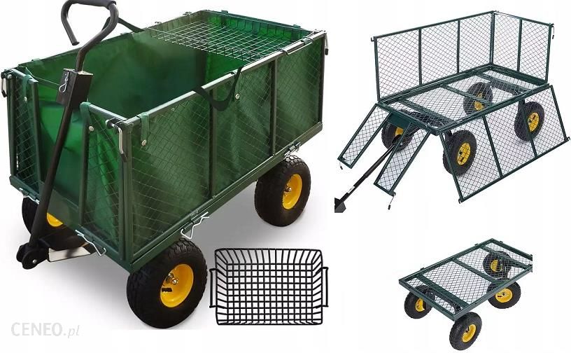 Duży Wózek Ogrodowy Przyczepka XXXL + koszyk gratisNasz wózek ma 2x wyższe burta od innych produktów na allegro – aż 41cm !!!WAGA: 23kg / 220 litrówWielofunkcyjny duży wózek ogrodowy, przyczepka do 500 kgWózek ogrodowy na pompowanych kołach z uchwytem do ciągnięcia.Niezastąpiony podczas prac ogrodowych. Przeznaczony do transportowania narzędzi ogrodniczych, sadzonek, donic, ziemi, gałęzi, liści, a nawet owoców lub warzyw. Prezentowana wywrotka ogrodowa charakteryzuje się wytrzymałą i stabilną konstrukcją.Maksymalny udźwig wynosi 500 kilogramów, a pojemność wynosi 220 litrów.Wózek wyposażony jest w wygodny, antypoślizgowy uchwyt, który ułatwia ciągnięcie nawet podczas pełnego załadunku.Konstrukcja ze stali, malowanej metodą proszkową w zielonym kolorze.Koła pompowane, z bieżnikiem, doskonale amortyzują wstrząsy oraz zapewniają komfort prowadzenia. Wysoka jakość użytych w ich produkcji materiałów zapewnia przyczepność na każdej nawierzchni.Dlaczego właśnie nasz produkt?łączy w sobie 3 funkcje: przyczepka, wózek i taczkawytrzymałość do 500 kgstalowa mocna konstrukcjabardzo wytrzymała misa załadunkowawysoka jakość – klasa PremiumDodatkowo GRATIS – metalowy nakładany koszyk (jedyna taka wersja na rynku)Nasz wózek posiada wiele zalet:dodatkowa plandeka do przewozu materiałów sypkich, jak ziemia, liście czy piachrozkładane burtywielofunkcyjna rączka (możliwość podpięcia jako przyczepkę do quada lub traktorka ogrodowego)duże 26 cm pompowane koła podwójnie łóżyskowane z bieżnikiem pozwalające przewozić ładunek w trudnym terenieantypoślizgowy uchwyt ułatwiający transportSpecyfikacja:Kolor konstrukcji: ciemny zielonyPojemność: 220lKonstrukcja wózka: stal malowana wysokiej jakości farbą proszkowąMateriał felg: stal malowana wysokiej jakości farbą proszkowąKoła: 26cm na łożyskach, pompowaneMaksymalne obciążenie: 500kgWYSOKA JAKOŚĆ !!!Nasz wózek posiada skrętne pompowane koła gumowe, co zapewnia łatwość transportu nawet dużych ciężarów po nierównym terenie.Felgi są stalowe malowane proszkowo co zapewnia długotrwałe użytkowanie (nie plastikowe jak w konkurencyjnych ofertach).Tylko nasz wózek posiada podwójnie łożyskowane koła dzięki czemu dużo łatwiej można transportować ciężkie materiały.Przegubowy dyszel ułatwia skręcanie i ciągnięcie za pojazdem.Rama naszego wózka wykonana jest wytrzymałej stali malowanej proszkowo, a wytrzymała plandeka z uchwytem do przenoszenia ułatwia opróżnianie zawartości.Towar nowy oryginalnie zapakowany.
