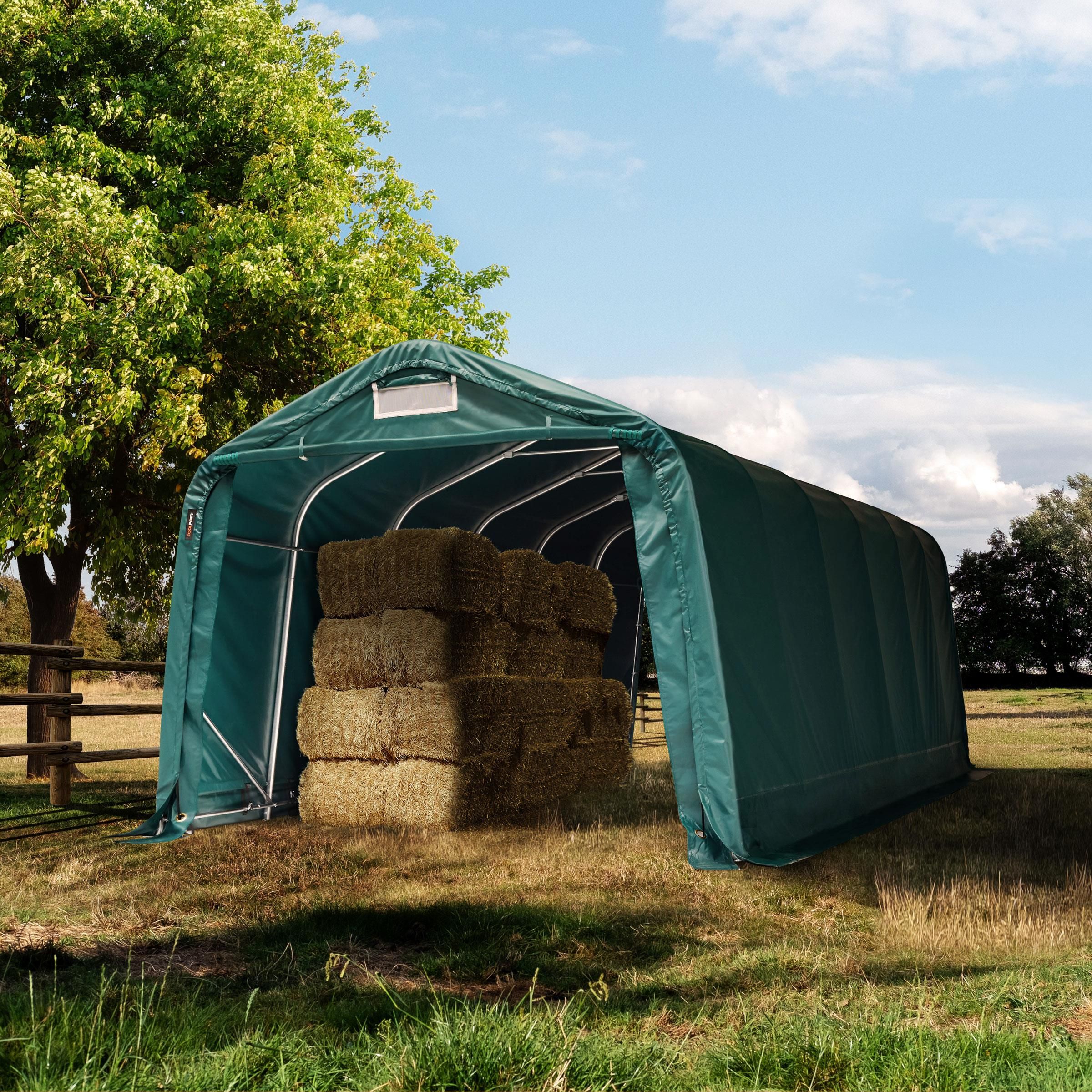 Namiot dla koni Toolport® 3,3×7,2m w kolorze ciemnozielony służy jako elastyczne schronienie Twoich i innych zwierząt. Składa się on z całkowicie ocynkowanej konstrukcji stalowej, której elementy łączone są wysokiej jakości systemem zatrzaskowym, zapewniając ochronę Dzięki wytrzymałej plandece PCV o gramaturze 550g/m² namiot oferuje przyjemne niezawodne zarówno przed słońcem, jak deszczem. W razie potrzeby istnieje możliwość zamknięcia jednej lub obu stron namiotu za pomocą odpowiednich ścian przednich tylnych.
