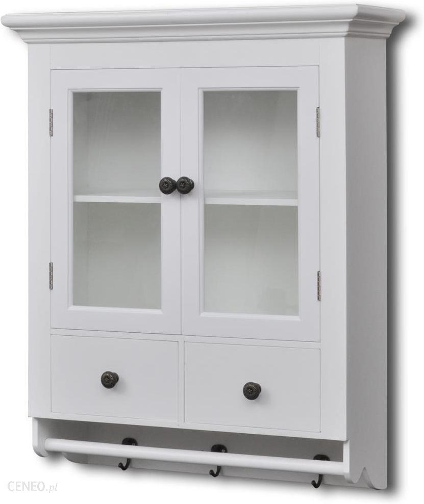 Ta elegancka, drewniana szafka w starym stylu zapewni Ci mnóstwo miejsca do przechowywania i uporządkowania rzeczy w kuchni. Szafka ma dwie szuflady i dwie półki pozwalające na schowanie płatków, słodyczy, puszek i innych produktów. Dwoje przeszklonych drzwi i szuflady otwierają się z łatwością, możesz więc szybko sięgnąć potrzebne rzeczy. Wieszaki i kołki posłużą do powieszenia kubków lub ściereczek. Wykonana z wysokiej jakości drewna szafka dobrze zniesie wilgotne środowisko. Wykończona białą farbą powierzchnia jest łatwa do czyszczenia wilgotną ściereczką.
